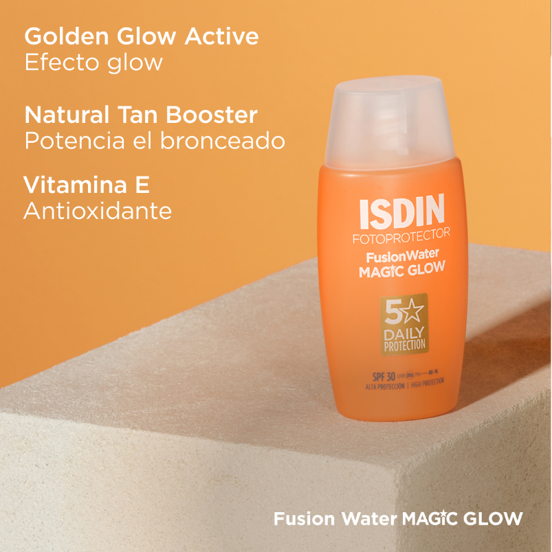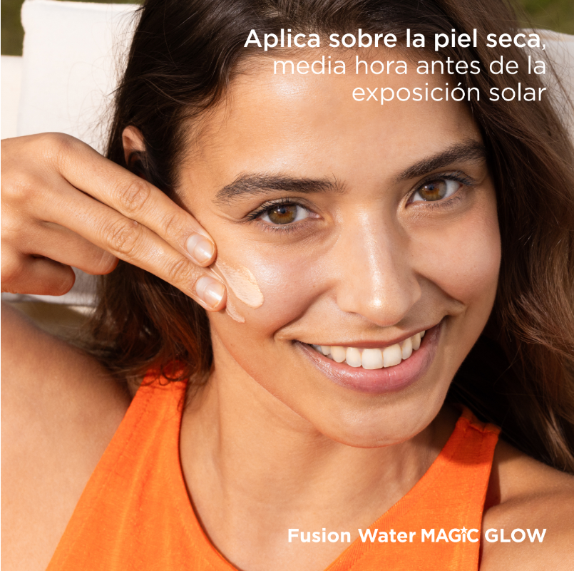 Protege tu rostro con Fusion Water MAGIC GLOW SPF 30, el fotoprotector facial ultraligero de absorción inmediata que se funde con la piel. Prolonga el bronceado natural y aporta luminosidad y efecto glow.